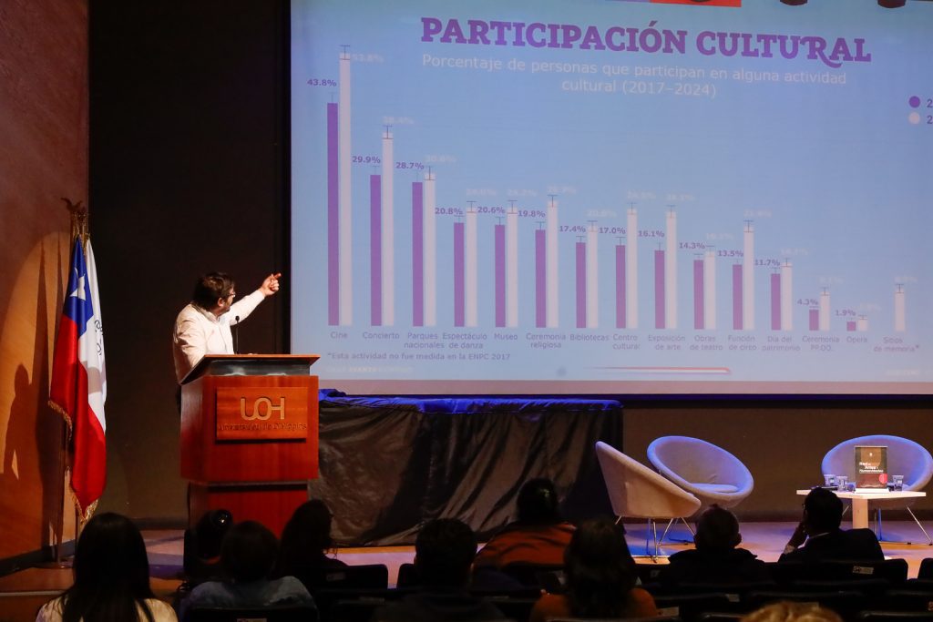 El encuentro se centró en el tema “Cultura, participación y cuidados” y contó con la participación del director regional del Instituto Nacional de Estadísticas (INE), René González; el jefe del Departamento de Estudios de la Subsecretaría de las Culturas y las Artes, Enrique Riobó; la directora de Cultura, Patrimonio y Extensión de la UOH, Clemencia González; y la coordinadora de la Red en Artes y Humanidades del CUECH, Ignacia Saona, junto a académicos, agentes culturales y estudiantes.
