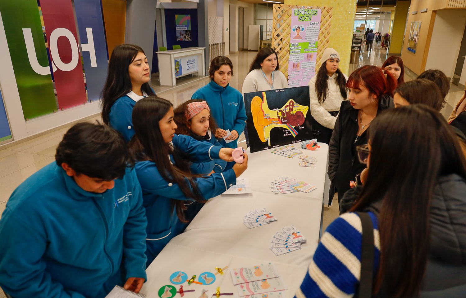 Estudiantes de tercer año de la carrera de Pedagogía en Educación Especial de la Universidad de O’Higgins (UOH) realizaron una muestra de stands informativos, en el hall principal del Campus Rancagua, en el marco del curso Discapacidad Auditiva. Esta asignatura tiene como propósito entregar herramientas pedagógicas que permitan una intervención educativa inclusiva con personas que presentan esta condición.