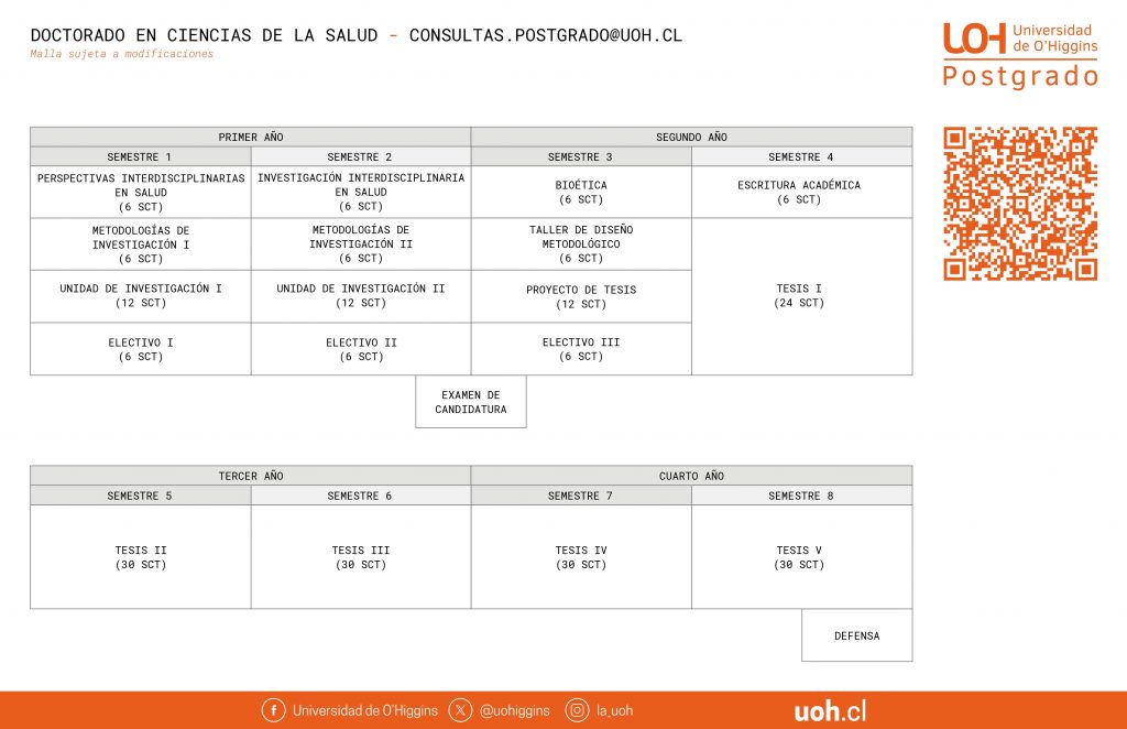 El plan de estudios del programa de Doctorado en Ciencias de la Salud tiene una duración de ocho semestres a jornada completa y contempla un total de 240 créditos (SCT-Chile). De estos 78 SCT corresponden a cursos obligatorios (teóricos obligatorios, unidades de investigación y proyecto de tesis); 18 SCT a cursos electivos y 144 SCT al desarrollo de la tesis doctoral. 1 crédito es equivalente a 27 horas de trabajo.