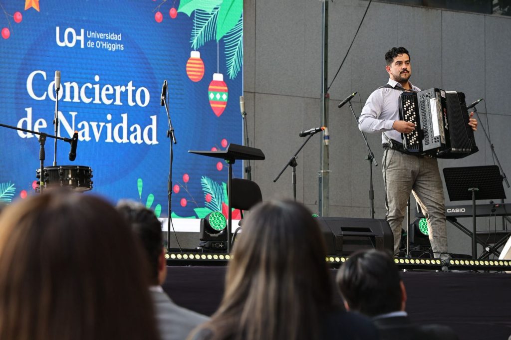 En el frontis del Campus Rancagua, la Universidad de O’Higgins (UOH) congregó a familias, funcionarias/os, estudiantes y vecinas/os de la región en un Concierto de Navidad que llenó la noche de música, brillo y comunidad. La actividad, organizada por la Dirección de Cultura, Patrimonio y Extensión, ofreció una experiencia cargada de emoción, con presentaciones del campeón mundial de acordeón Joaquín Muñoz Donoso, el Coro UOH y el Coro Polifónico de Rancagua.