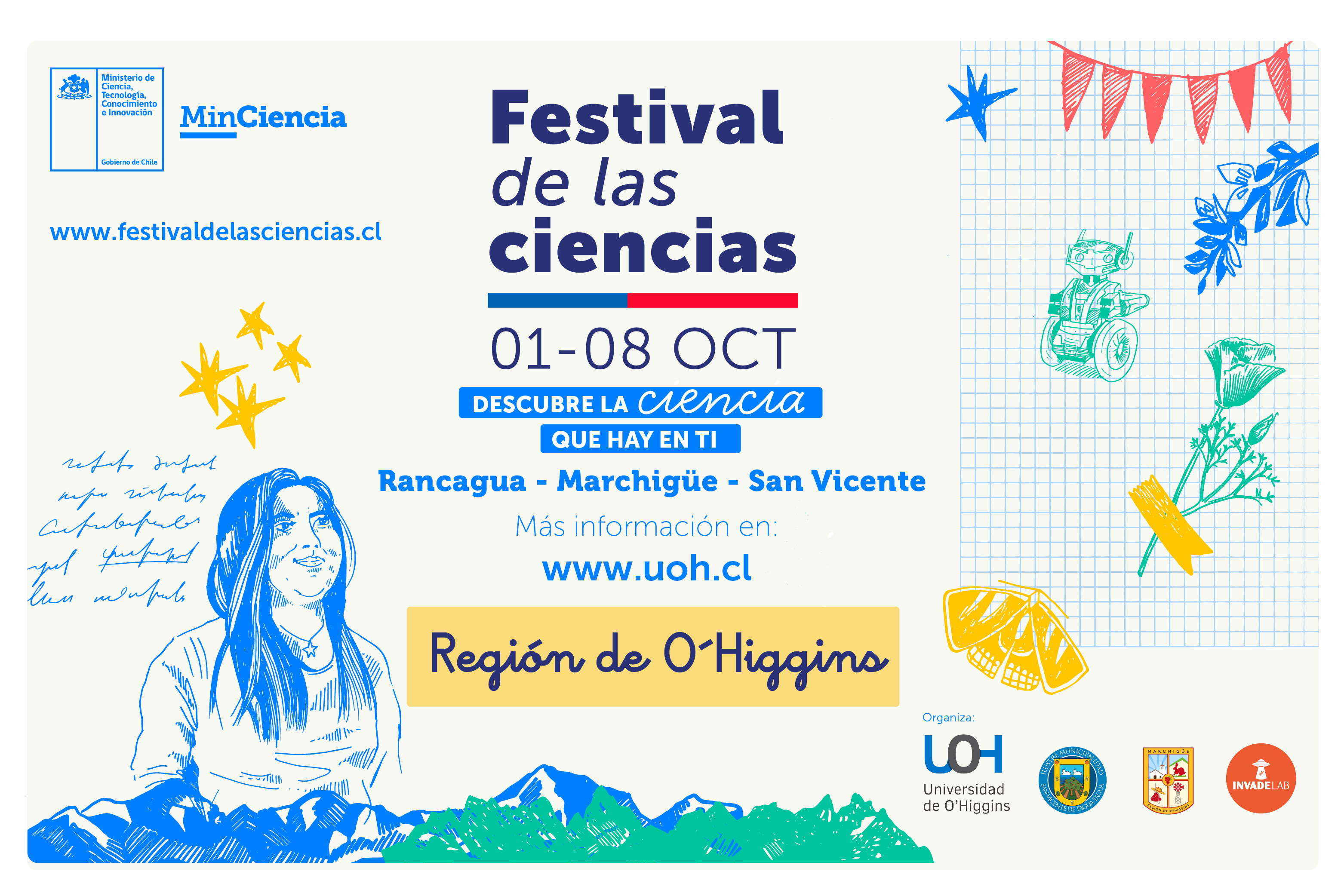 Con tres fiestas presenciales en Rancagua, Marchigüe y San Vicente, más un concurso para toda la Región de O’Higgins, la Universidad de O’Higgins volverá a ser anfitriona de la festividad científica más grande del país: el Festival de las Ciencias que organiza el Ministerio de Ciencia, Tecnología, Conocimiento e Innovación para todo el territorio nacional.